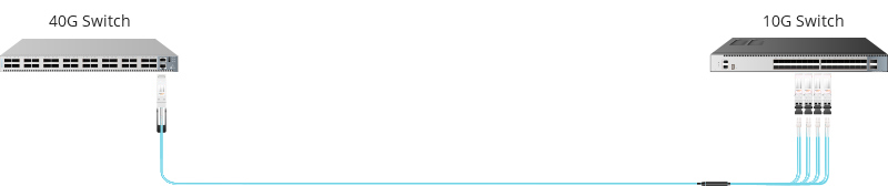 At present, a variety of QSFP+ AOC cables have been launched for 40G applications, including 40G QSFP+ AOC, 40G QSFP+ to 4x SFP+ breakout AOC, and 40G QSFP+ to 4x duplex LC breakout cables (sometimes also named 40G QSFP+ to 8x LC connectors breakout cables). And some providers offer a customized service of 40G QSFP+ to 8x SC/ST/FC connectors breakout cables. The 40G QSFP+ AOC cable is a cost-effective means to connect 40G ports on two switches directly. The 40G QSFP+ breakout AOC cables are suitable for network upgrade from 10G to 40G. Note that, the QSFP+ to 4x duplex LC breakout cables should use four SFP+ transceivers to connect the LC connectors, like the following figure shows.
