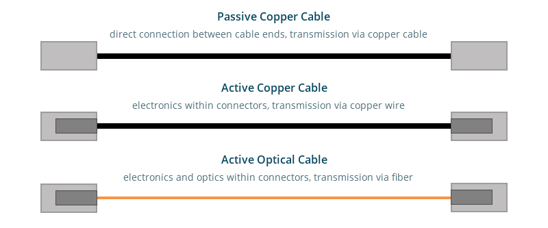 Because DAC and AOC use different designs, they work differently. Passive and active DAC use copper cable to deliver the electric signals. Passive DAC can transmit signals directly without signal conditioning, active DAC uses the driving chip inside the transceivers to boost signals, and AOC requires external power to convert signals from electric to optical, and then electric at last. It uses optical fibers not the copper cables to complete the transmission.