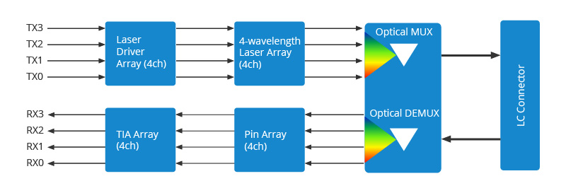 40G QSFP+ LC transceiver—On the transmit side, 4-channel 10G serial data streams are passed to laser drivers. The laser drivers control directly modulated lasers (DML) with wavelengths. Then the output of the four DMLs is optically multiplexed to a fiber cable through an LC connector, combining as a 40G optical signal. On the receive side, the 40G optical signal is demultiplexed into 4 individual 10G channels with different wavelengths. Each wavelength light is collected by a PIN and then outputted as electric data after amplified by a TIA (transimpedance amplifier). Unlike 40G QSFP+ transceivers with MTP interfaces, 40G QSFP+ transceivers with LC interfaces cannot be split into 4x10G as they use 4 wavelengths on one pair of SMFs.