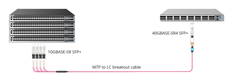 No matter what type you choose, all these QSFP+ breakout cables can split a 40G connectivity into 4x10G channels (just like the following figure shown), while you connect them with a QSFP+ switch on the one end and several 10G devices (up to four) containing SFP+ ports on the other end.