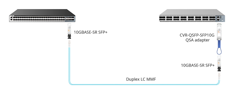 Another way to directly convert QSFP+ to SFP+ port is via the help of a 10G type of the QSA (quad small form-factor pluggable adapter): COCVR-QSFP-SFP10G. Built-in a QSFP+ form factor with a cage for SFP+ module at the back, this QSFP+ to SFP+ adapter enables smooth connectivity between devices that use 40G QSFP+ port and 10G SFP+ port. To have a 10G connection, you can insert an SFP+ module into a QSFP+ to SFP+ adapter and then connect this COCVR-QSFP-SFP10G adapter to a QSFP+ port. In that connection, the QSFP+ to SFP+ adapter will act as an interface of an SFP+ module.