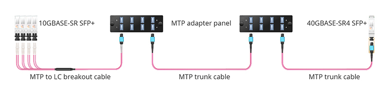 To migrate a QSFP+ port to SFP+ port, the transmission distance should be the prior thing to be checked. Based on that, you can decide to use what type of transceiver and connectivity. Usually, the inter-connect type, with a combined use of 40G MTP/MPO trunk cables and 8-fiber cable assemblies like figure 4 shown, will be more suitable for long-distance transmission. Even for the direct connection, the QSFP+ to 4xSFP+ AOC/DAC cable is limited for a short-reach distance compared with the other two types.