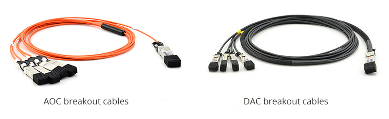QSFP+ to SFP+ breakout cable consists of a QSFP+ connector on one end and four SFP+ connectors on the other end. Generally speaking, QSFP+ to SFP+ breakout cable can be divided into direct attach copper cable (DAC) and active optical cable (AOC). They are used to transmit 40Gbps data into four separate streams of 10Gbps data over a fan-out cable in a point-to-multipoint configuration.